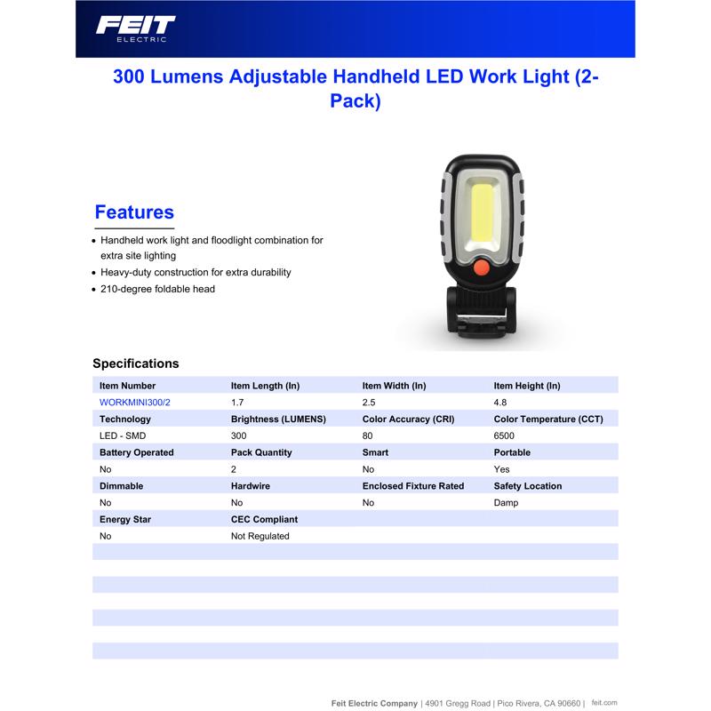 Light up the worksite with the Feit Electric WORKMINI300 handheld LED work light. With a flexible neck, durable construction, and IP54 water and dust resistance, this super thin work light outputs 300 lumens of 6500K daylight color temperature light. Flip the light to use the built-in 80-lumen flashlight on one end. An attached hook and magnet allow the work light to be easily carried and stowed anywhere. This light operates on 3 AAA batteries and provides up to 5 hours of continual light. Choose a Feit Electric work light for your portable lighting needs.