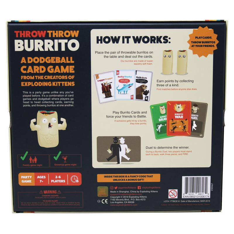 Throw Throw Burrito is the world's first dodgeball card game! Try to collect matching sets of cards faster than your opponents while simultaneously ducking, dodging and throwing squishy airborne burritos. The cards you collect earn points, but getting hit by flying burritos loses them.