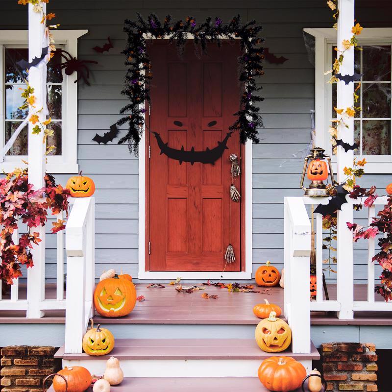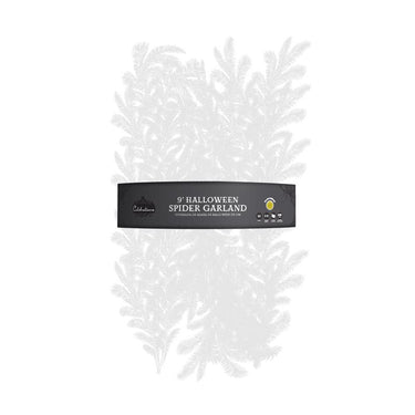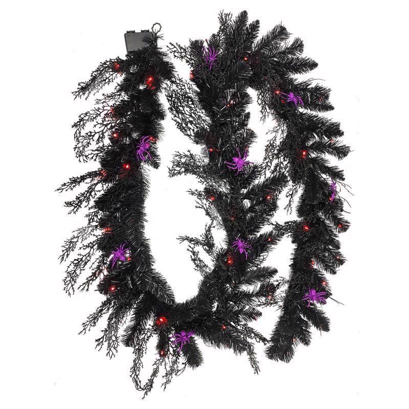 This garland is mixed black foliage and black twig garland with purple spiders, 100 tips and 50 orange LED battery operated rice lights.