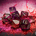 This set contains 7 Gemini Translucent Red-Violet dice with gold numbers with the following shapes: