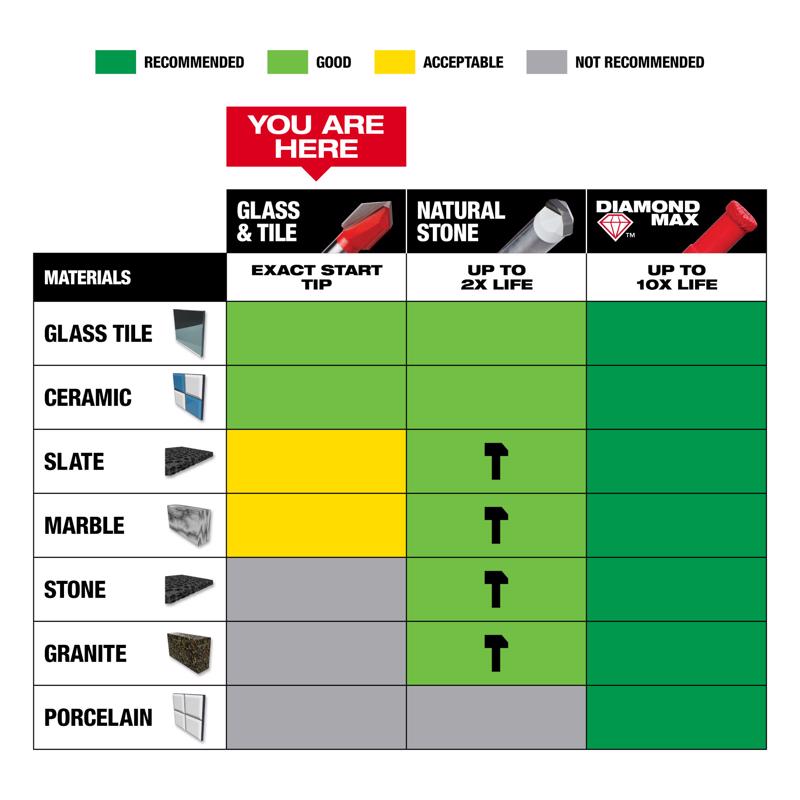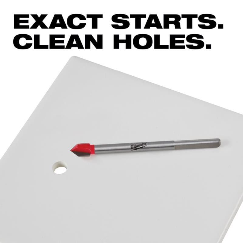 The Milwaukee 4-pc glass and tile drill bit set features an exact start tip for clean holes and minimal bit walking in glass and ceramic tile. Engineered with sharpened carbide, Milwaukee glass and tile bits provide faster tile drilling than standard glass and tile bits. The reinforced carbide head provides increased durability when high-speed drilling into tile and glass. These bits are specifically designed for drilling holes in glass and ceramic tile with drill drivers only.