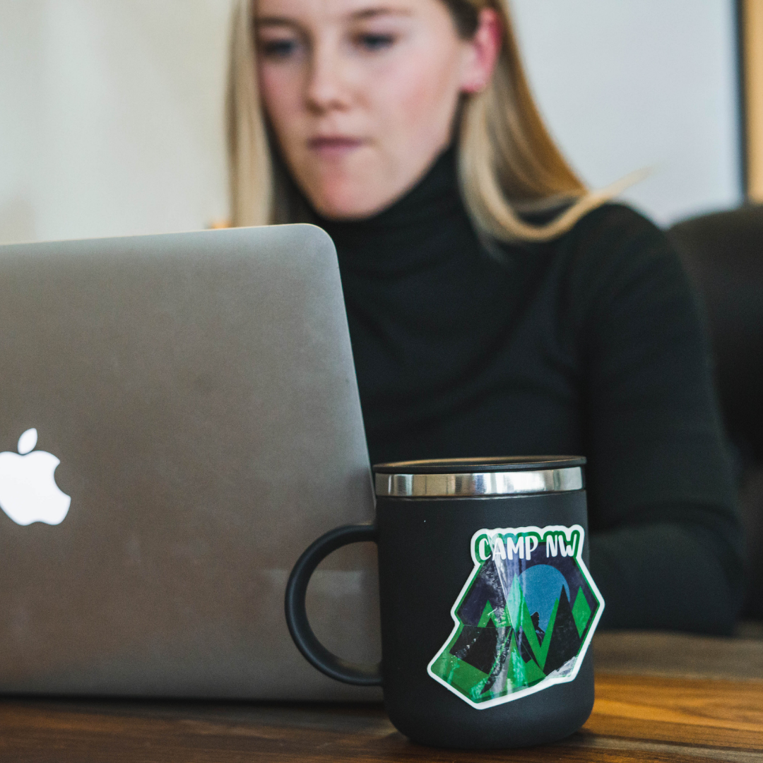 Display your passion for the great outdoors with this stylized campsite sticker. Sharp, graphic shapes in high contrast shades of black, green, and teal come together to create a familiar camping scene with the words "CAMP NW" at the top. Can you spot Sasquatch? 3"-by-2.5"