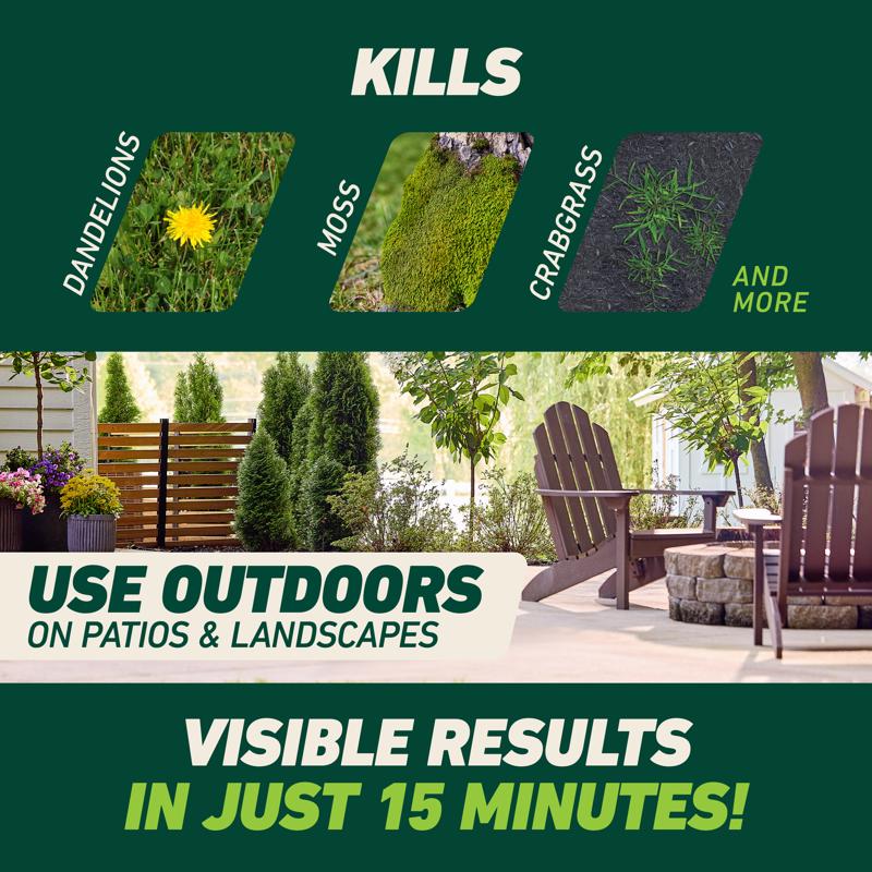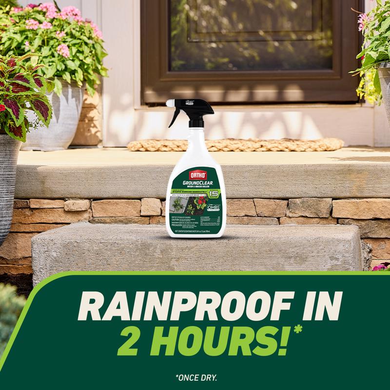 Control weeds and unwanted grasses with Ortho GroundClear Weed & Grass Killer. This weed and grass killer acts on contact to control common chickweed, dandelion*, moss, oxalis and others (as listed). It also controls grasses including crabgrass (large), bluegrass (annual)* and perennial ryegrass*. With this weed killer, you'll see results in 15 minutes. In addition, this product is OMRI listed for organic use. Use this weed control product to kill weeds and unwanted grasses in, on and around walkways and driveways, under trees, and in landscape beds. The trigger sprayer allows you to accurately target weeds you want to kill. To use, simply spray weeds at the desired setting. For best results, apply this landscape weed control when weeds are small and actively growing. Do not allow spray to contact wanted plants. Do not allow children and pets to enter application area until sprays have dried. Not for food use plants. This ready-to-use 24 fl. oz. container of Ortho GroundClear Weed & Grass Killer with trigger sprayer kills listed weeds so you can enjoy your landscape. *Multiple applications may be required for control of these weeds and grasses