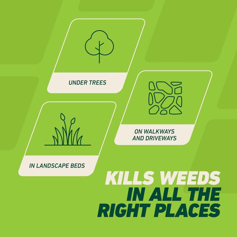 - This weed and grass killer controls weeds in, on and around walkways and driveways, under trees, and in landscape beds; not for use on lawns or grasses you like
