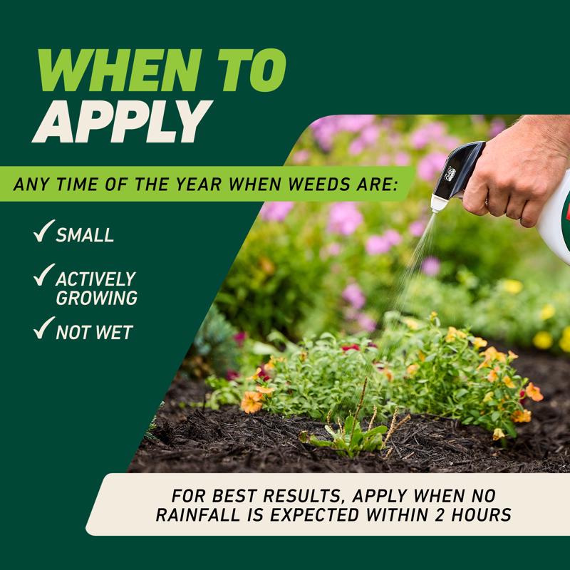 - Apply when weeds are small, actively growing and not wet from rain, dew or irrigation