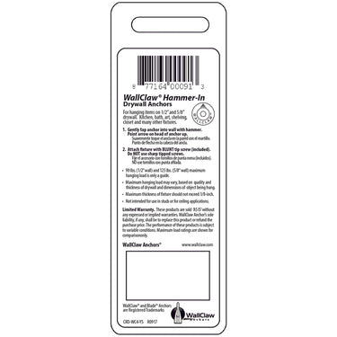 WallClaw Anchors are a hammer-in drywall anchor designed for use in both 1/2 inch (90 lbs) and 5/8 inch (125 lbs) drywall. No drilling is required. Simply hammer it in like a nail, attach the fixture to be mounted to the wall and fasten. It is the fastest, easiest and among the strongest anchors available on the market. The WallClaw Anchor has a finish nail starter and a blade-like body that easily penetrates drywall with minimal damage to the wall. This means the holding strength of the anchor in the drywall is greater. The anchor's wide platform fins near the head provide greater load bearing capacity. WallClaw anchors are made of engineered nylon.