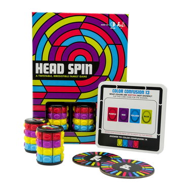 Head Spin is a fast-paced game where fidgety fingers race against masterminds. On each round players will try to figure out the color order based on the prompt. Then they’ll show that answer on their spinner and place it on the landing pad. The first player to show the correct answer on their spinner wins the round