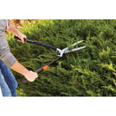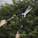 Ideal for trimming and shaping hedges and decorative shrubs, Fiskars Power Lever Extendable Hedge Shears feature compound lever technology that multiplies your leverage to give you up to 2x more cutting power than traditional single pivot shears. These shears also include handles that extend and lock securely, making high, hard to reach and awkward angles easier. Fully hardened, precision ground steel blades feature a serrated edge that grips while cutting, and a patented self sharpening design ensures that every cut is clean and crisp. A rust resistant, low friction blade coating makes cutting even easier, shock absorbing bumpers absorb jarring vibrations, and durable steel handles with non-slip grips offer control.
