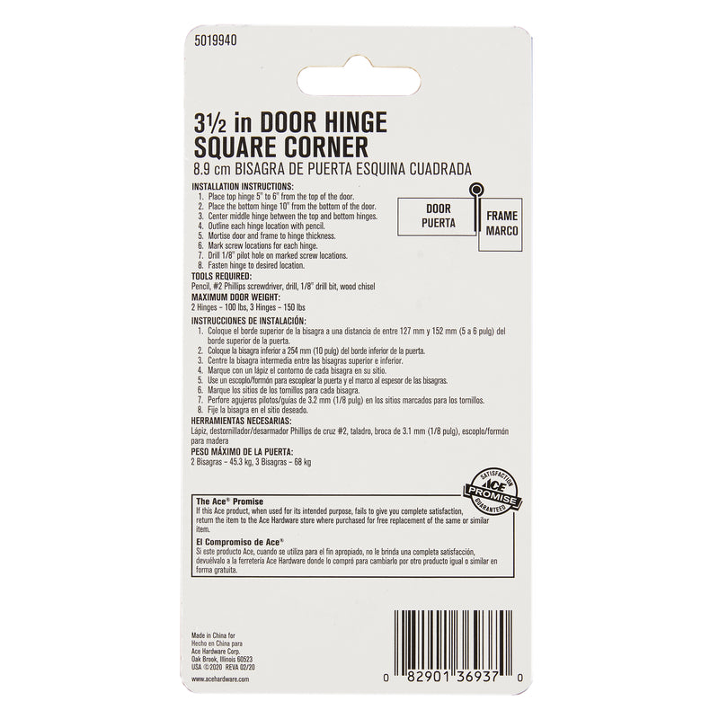 Ace residential hinges are a great choice for residential, commercial, window, furniture and a variety of other applications. 1 PACK