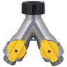Use this 2-way metal shut-off to control water flow to your watering accessories. A free-spinning coupling nut allows you easily attach it to any faucet.