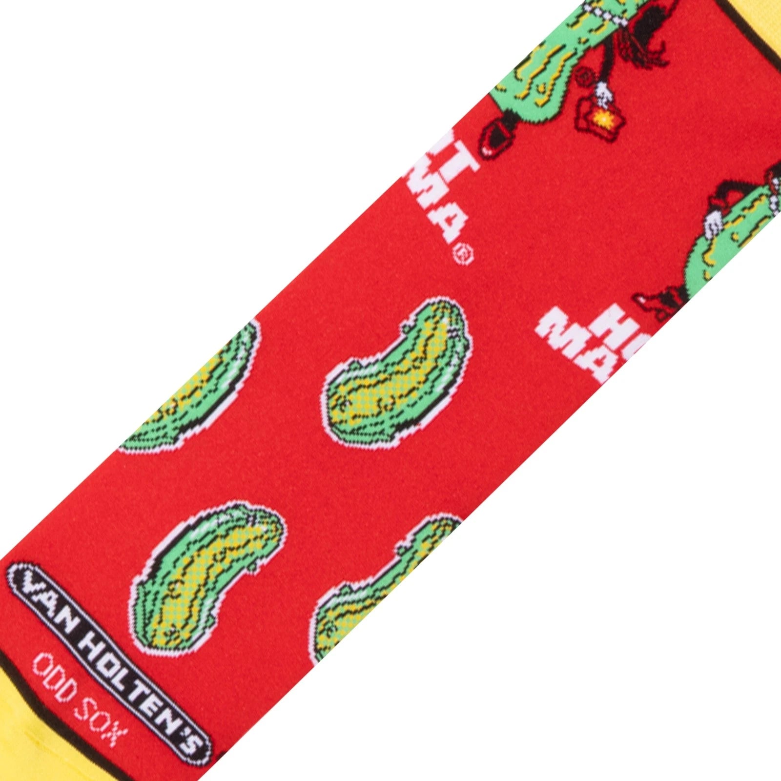 Turn up the heat with these Hot Mama Crew Socks by Van Holten’s Pickles. These bold red socks bring serious snack energy, starring the fiery Hot Mama mascot up top with her name proudly underneath. Down below, dancing pickles brings the party to your feet. Finished with a yellow toe, heel, and cuff for that extra tangy flair.