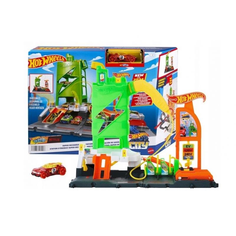 - Drive into the Hot Wheels City Super Recharge Fuel Station for dynamic play with Hot Wheels vehicles.