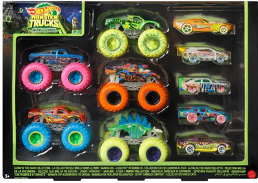 Description:   With 10 vehicles together this set of Hot Wheels Monster Trucks Glow in the Dark is an instant collection! Five die-cast monster trucks and five 1:64 scale die-cast cars provide endless smashing and crashing play -- with the lights on or off! Glow-in-the-dark elements bring a new edge to light speed. Kids can collect other Monster Trucks vehicles and toys for even more stunting racing and battling play! Makes a great gift for kids 4 to 8 years old especially monster trucks fans! Colors and decorations may vary.
