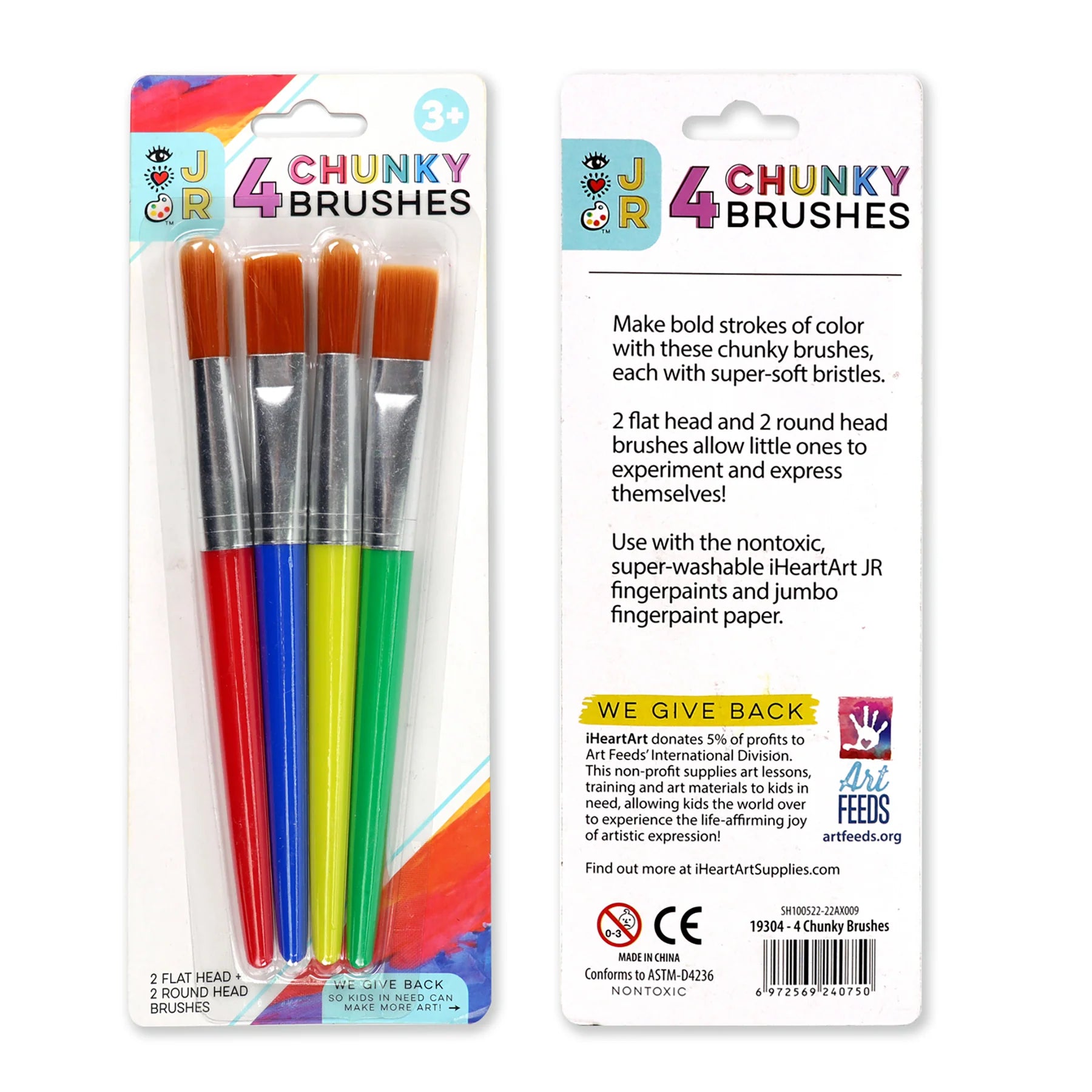 4 chunky, colorful brushes with super-soft bristles for young painters. The 2 flat and 2 round bristle-heads let them experiment with different types of lines and strokes. Brightly colored, chubby handles are easy-to-hold. The bristles are great for fingerpaints and tempera paints. Just wash away your paints with soap and water to preserve your brushes. Part of the iHeartArt JR collection of high-quality art supplies made just for young kids aged 3-5.