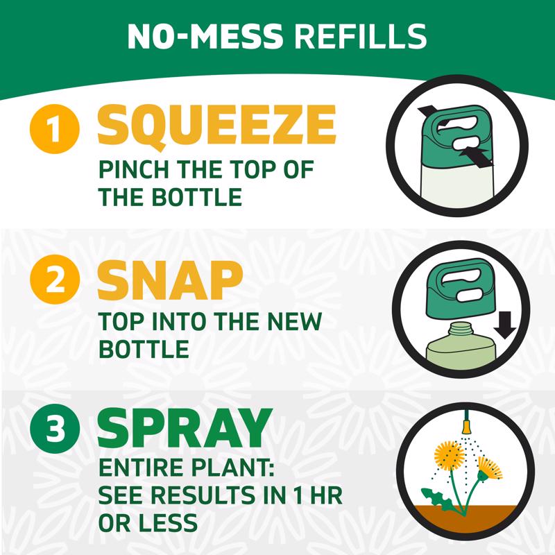 • NO-MESS REFILL: Snap & Spray refills are designed to eliminate mixing and pouring. Just squeeze the top off your empty bottle and replace with a ready to use refill.