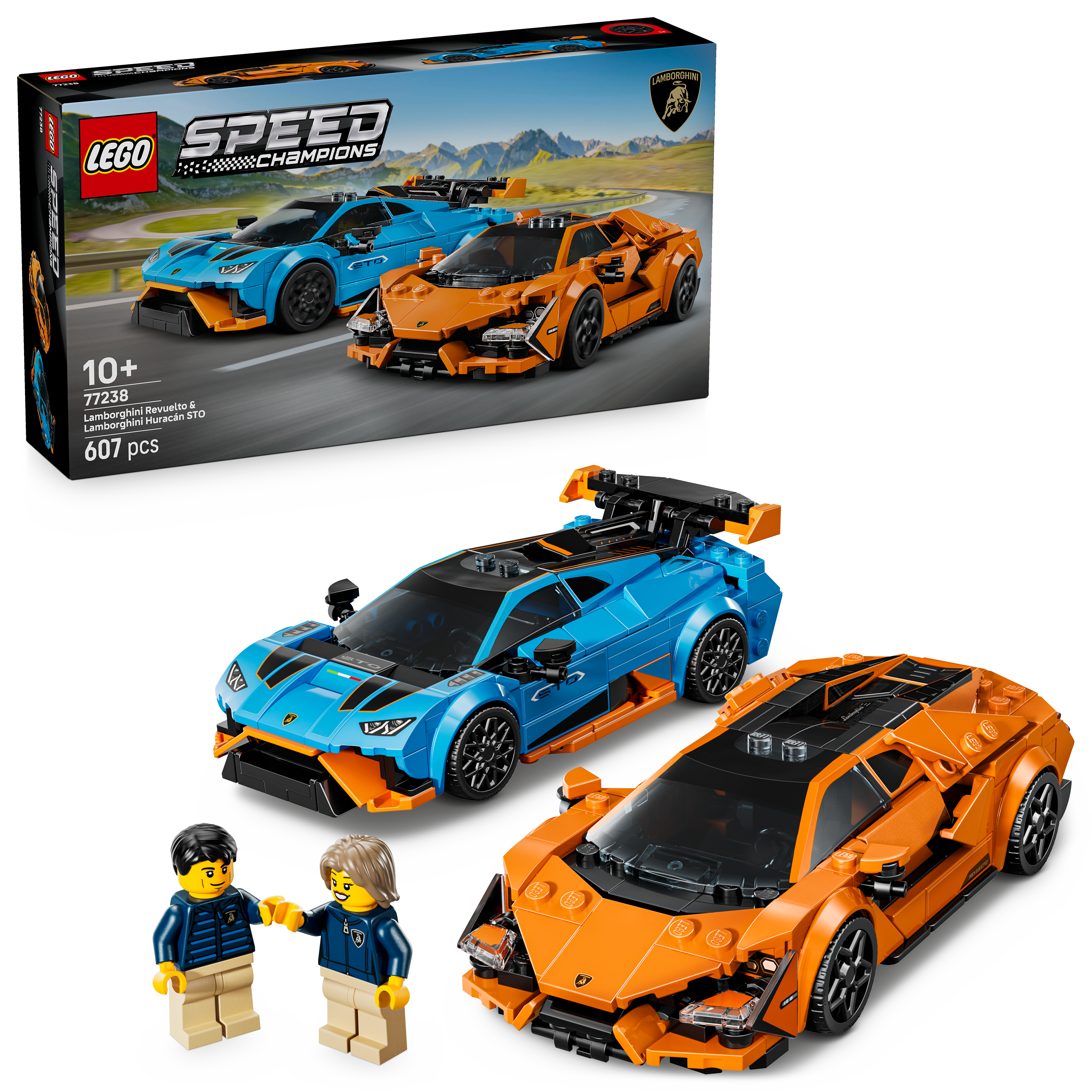 Kids can explore Lamborghini’s distinctive style, engineering and design with this double pack of LEGO® Speed Champions Lamborghini Revuelto & Huracán STO (77238) toy cars. This model kit with 2 LEGO race cars to build, display and play out stories with makes a great gift for boys and girls aged 10 and up and adult collectors. The Revuelto, with its V12 engine, is the Italian carmaker’s most powerful model ever and the Huracán STO is designed for both the street and track. Both car toys include authentic Lamborghini details from the real-life vehicles, including the air intakes, wings and futuristic Y-shaped headlights and taillights. Each toy car comes with a driver minifigure for kids to place behind the wheel and play out races. LEGO Speed Champions car building kits let kids and car fans build replica versions of some of the world’s most iconic vehicles. Each LEGO toy car playset can be created using printed building instructions or the LEGO Builder app. Set contains 607 pieces.