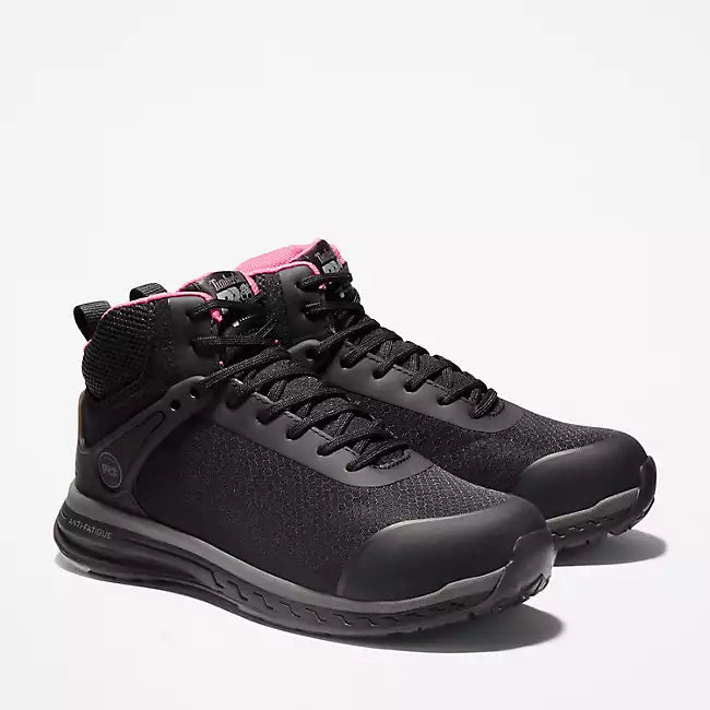 Built specifically for a comfortable women's fit, our metal-free Timberland PRO® Drivetrain athletic work boots offer lightweight comfort, but they're all business when it comes to protection. Not only are their abrasion-resistant ripstop mesh uppers tough enough to handle working on your feet all day, they feature composite safety toes, TPU toe overlays, and are designed for Electro Static Dissipating (ESD) compliance to minimize hazards from static electricity buildup. For comfort, we added Anti-Fatigue Technology for all-day shock absorption and energy return and a breathable, moisture-wicking lining made of ReBOTL™ material containing at least 50% recycled plastic. Plus, their lightweight outsoles are made of heat-, oil-, slip-, and abrasion-resistant, non-marking, all-weather TPU for enhanced traction.