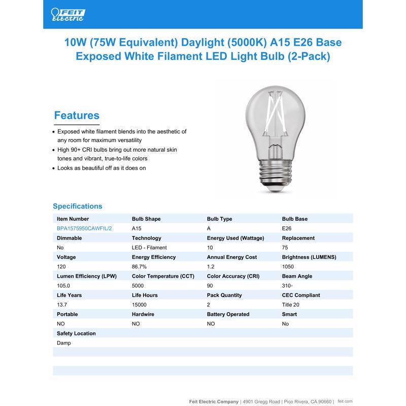 Upgrade your lighting to Feit Electric's elegant Exposed White Filament LED Bulbs for a fresh take on decorative bulbs. These first-of-their-kind white filament bulbs take a traditional clear glass A-shape bulb and add lower-profile white filaments. Unlike yellow filaments, these blend into your current decor, for a timeless look that complements any room. Their bluish-white light is perfect for reading, working on intricate projects, and seeing fine details. Use these bulbs in any fixture with a medium E26 base for a variety of general-purpose and decorative lighting applications. BPA1575950CAWFIL/2 bulbs emit 1050 lumens of light while using just 10 watts, up to 86.7 Percentage less energy than standard 75-watt incandescent bulbs. Get up to 15,000 hours of life with an estimated energy cost of only 1.20 per year. Create a stylish feel that instantly enhances both home and commercial spaces.