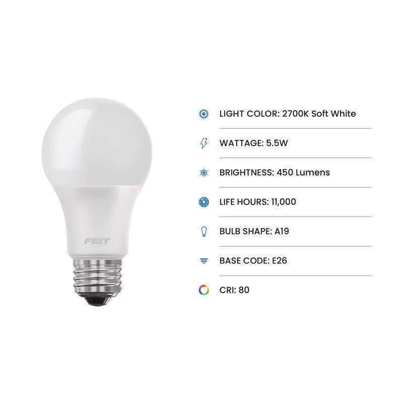 Enjoy all the benefits of advanced LED energy-saving technology with Feit Electric LED light bulbs. These general-purpose A-shape LED bulbs provide a similar light output to the equivalent incandescent, use less electricity and provide years of reliable energy efficient light.