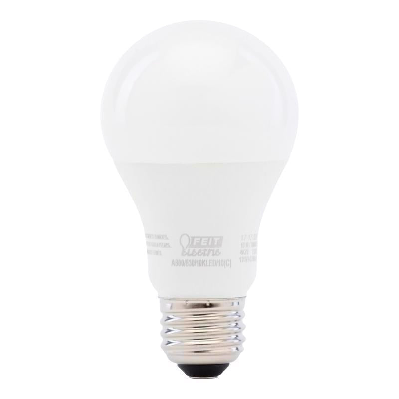 Enjoy all the benefits of advanced LED energy-saving technology with the Feit Electric A800/830/10KLED/24 24-Pack 60W A19 LED Light Bulbs. This 2700K soft white light is non-dimmable and will replace 60-watt equivalent incandescent bulbs. It produces a similar light output (800 lumens), uses 10 watts of energy and up to 83% less energy than a standard incandescent light bulb. Get instant on to full brightness with relatively cool running performance. Feit Electric bulbs have an average life of 11,000 hours/10 years are RoHS compliant and are 100% mercury free. Choose a dependable general purpose bulb for residential or commercial applications.