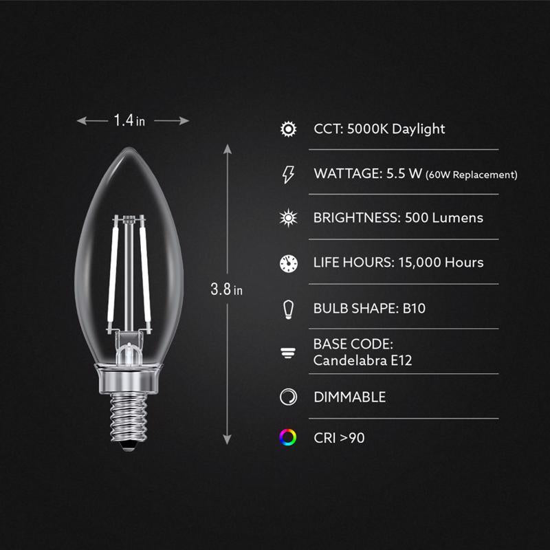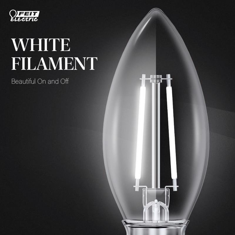 Upgrade your lighting to Feit Electric's elegant Exposed White Filament LED Light Bulbs for a fresh take on decorative bulbs. These first-of-their-kind white filament bulbs take a traditional flame tip bulb with exposed filament encased in clear glass and add lower-profile white filaments. Unlike yellow filaments, these blend into your current decor, for a timeless look that complements any room. They give off a 5000K Daylight White glow ideal for craft rooms, bathrooms, kitchens, laundry rooms, utility rooms, and anywhere you desire invigorating light. Their bluish-white light is perfect for reading, working on intricate projects, and seeing fine details. These dimmable bulbs fit in any E12 Candelabra base such as chandeliers, wall sconces, pendant lights, and more. With a 90+ CRI, these bulbs make colors appear more vivid and true-to-life. The BPCTC60950CAWFIL/2/6 emits 500 lumens while only using 5.5 watts of electricity, up to 90.8% less energy than equivalent 60-watt incandescent bulbs. Get up to 15,000 hours/13.7 years of use (based on 3 hours per day use) with an estimated annual energy cost of only $0.66. Create a stylish feel that instantly enhances any home or commercial space.
