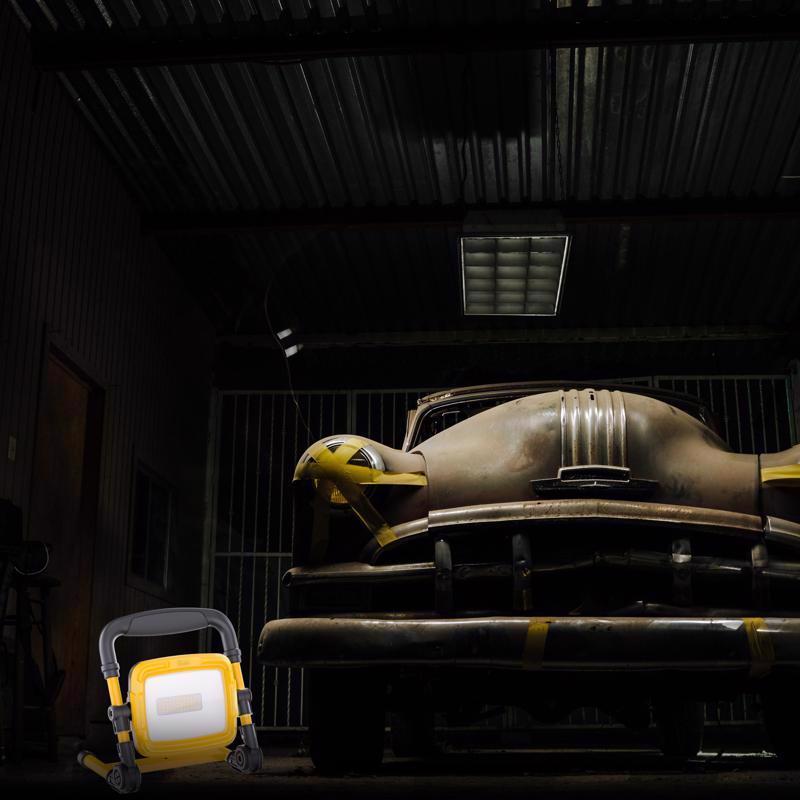Light up the worksite with the Feit Electric WORK3000XLPLUGFOLD portable plug-in LED work light. This unit is IP54 water and dust resistant rated, with cast metal housing and a heavy-duty 18/3 power cord. This light outputs up to 3000 lumens of 5000K Daylight color temperature light, and is rated to last 30,000 hours. A foldable design allows users to angle the light exactly where needed. Choose a Feit Electric work light for your portable lighting needs.