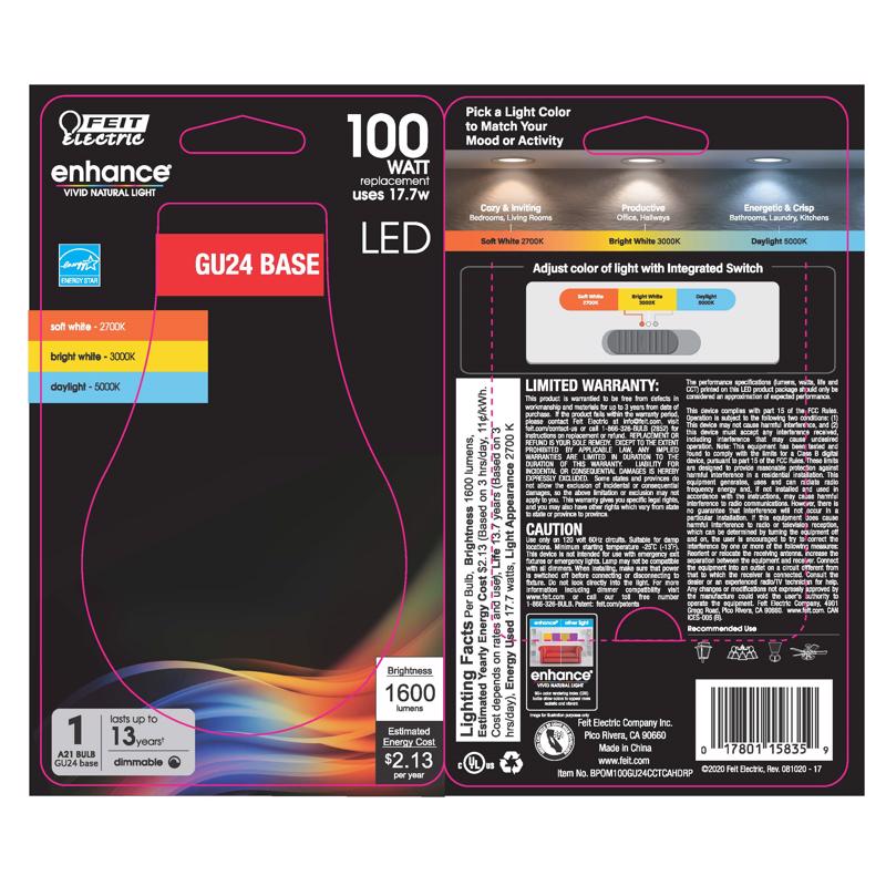 Enjoy all the benefits of advanced LED energy-saving technology with the Feit Electric BPOM100GU24CCTCAHDRP LED light bulb. This A21 bulb produces 1600 lumens of light using just 17.7W - up to 82 percent less than an equivalent 100W incandescent. Choose between Soft White, Bright White, or Daylight color temperatures all in one bulb with a flip of a switch. Pre-select a color temperature setting during installation for the perfect color in any space. Each bulb has an average life of 25,000 hours/22 years, are RoHS compliant, and are 100 percent mercury free. Choose a dependable decorative bulb to brighten your home.