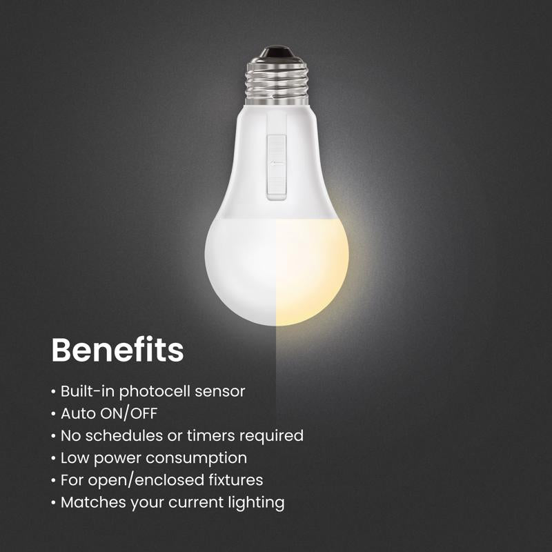 - Built in dusk to dawn photocell sensor detects natural sunlight and turns the bulb on when it's dark out and off during the day *
