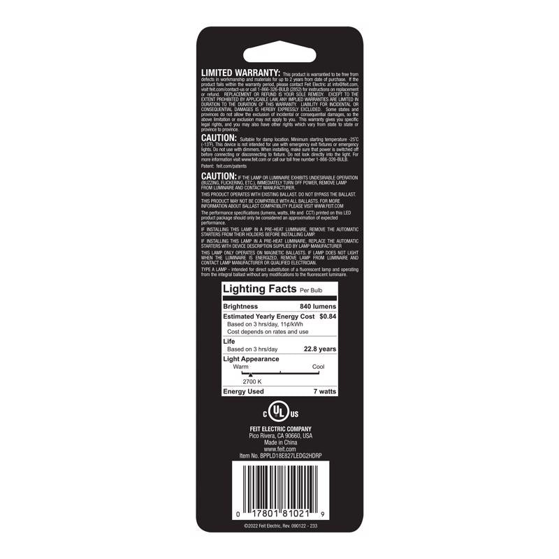 Upgrade your existing PL fixtures to advanced LED energy-saving technology with Feit Electric Double Twin Tube LED Bulbs. Shine a light on any task at hand with the BPPLD18E827LEDG2HDRP PL LED lamp. This 2700K Soft White non-dimmable light is ideal for creating a relaxing, comfortable mood in living rooms and bedrooms. It replaces G24q-2 4-pin 18-watt fluorescent bulbs, producing 840 lumens of light using 7 watts of electricity, up to 61% less energy than equivalent fluorescents. This bulb has an average life rating of 25,000 hours/22.8 years and is mercury free. A CRI over 80 means colors, tones, and environments look crisp and vibrant. Choose a Feit Electric energy-saving bulb for dependable lighting in residential or commercial settings.