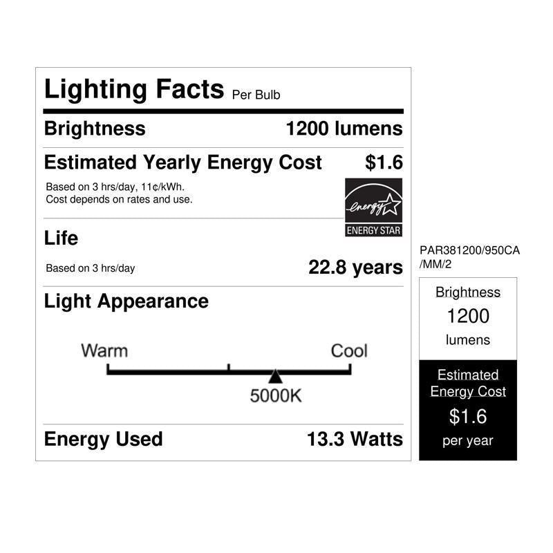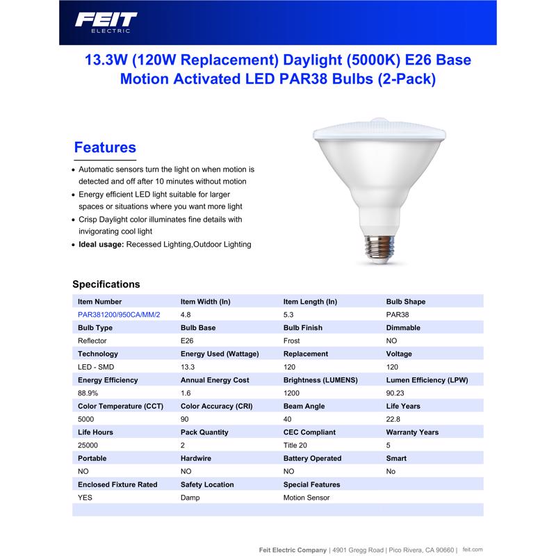 Keep areas well-lit without compromising home aesthetics with a dual-pack of Feit Electric motion-detecting reflector LED light bulbs from Feit Electric. These PAR38 bulbs output 1200 lumens of 5000K Daylight color temperature light using only 13.3 watts - up to 89% less energy than an equivalent 120-watt incandescent. Integrated sensors automatically turn the light on when motion is detected, improving safety and convenience. For added energy efficiency, lights will turn off automatically after 10 minutes without motion. Choose a dependable Feit Electric motion-activated light bulb for your outdoor security needs.