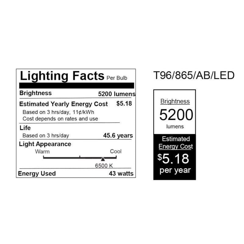 Feit Electric's 43 watt (59 watt equivalent) Daylight Deluxe White Direct Replacement or Ballast Bypass (Type AB) Non Dimmable LED Lamp replaces either T8 or T12 fluorescent and LED tubes. Install these versatile lights in two ways: plug and play direct replacement using the existing ballast with no rewiring necessary, or direct wire installation bypassing the ballast. Bypassing the ballast for efficient operation and less maintenance over time. These 5200-lumen LED lights use 27.1% less energy than equivalent fluorescents. Bluish white 6500K Daylight Deluxe White lights allow you to see objects in finer detail and create a vibrant mood for both residential and commercial spaces. Use them in closets to see every wardrobe detail. They are ideal for retail stores, gyms, convenience stores, and hospitals, and high-traffic locations where customers and employees need to feel alert or focused. T96/865/AB/LED lights offer flicker-free instant-on illumination with no warm-up time. They are mercury-free and shatter-resistant, for easy disposal. Lower heat emission extends the life of the tube and prevents lamp ends from blackening. The estimated energy cost is only $5.18 per year. Switch to Type AB LED linear lights for your space and get up to 50,000 hours of superior light. That's 45.7 years with 3 hours of daily use.