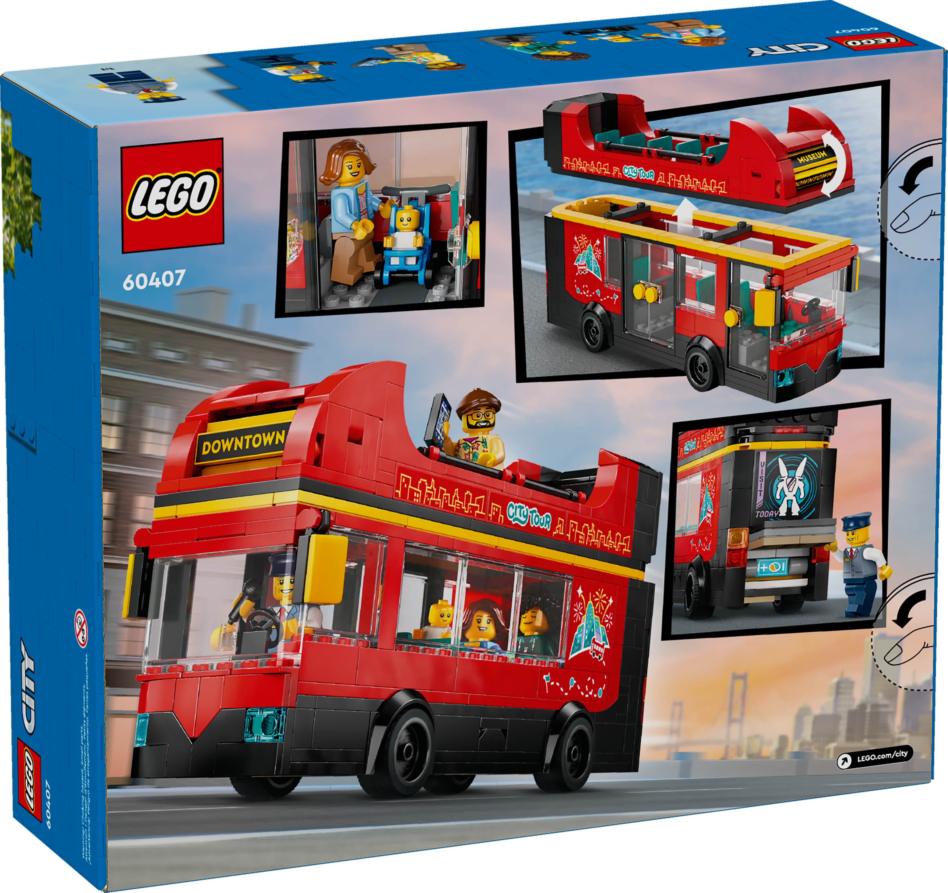 A Double-Decker Build-and-Play Journey for Kids Treat kids to endless city tour adventures with this LEGO® City Red Double-Decker Sightseeing Bus toy (60407) for ages 7 and up. Kids can rotate the destination display to choose between the harbor, downtown, the museum or the park, pick up waiting passengers en route and seat them on the cozy lower deck or the open-air sightseeing deck for a bird’s-eye view. This classic red bus toy makes a great display piece for any kid’s room and includes a driver and 3 passenger minifigures, plus a baby figure with a stroller, for imaginative role play and storytelling.
