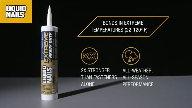 Liquid Nails extreme heavy duty construction adhesive, LN-907, offers outstanding adhesion, durability and performance in extreme conditions, bonding in temperatures from 22 deg F to 120 deg F. All weather, all season performance helps get the job done right in any condition. Also features a durable plastic tube for outdoor storage all year round. Certified by UL Environment to meet the GreenGuard Gold Standard as a low emitting material.