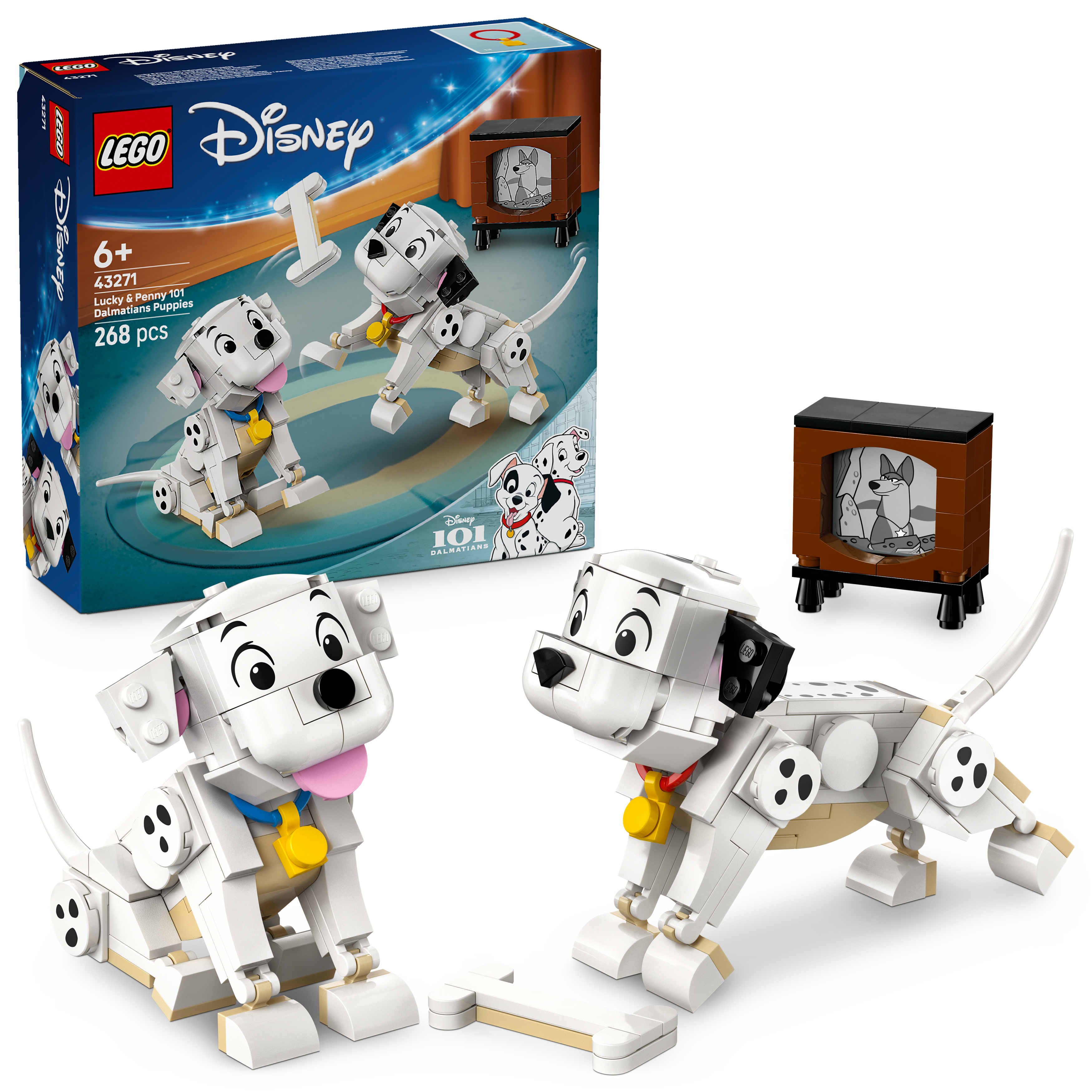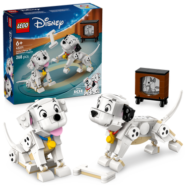 Thrill kids or animal fans aged 6 years and up with the Lucky & Penny 101 Dalmatians Puppies (43271) in this LEGO® ǀ Disney building toy. Packed with play options, the building toy includes 2 Dalmatian puppy characters from the Disney classic 101 Dalmatians, plus a brick-built toy bone and a small TV. The LEGO ǀ Disney puppy characters have movable heads, legs and tails, and can be posed in a variety of ways.