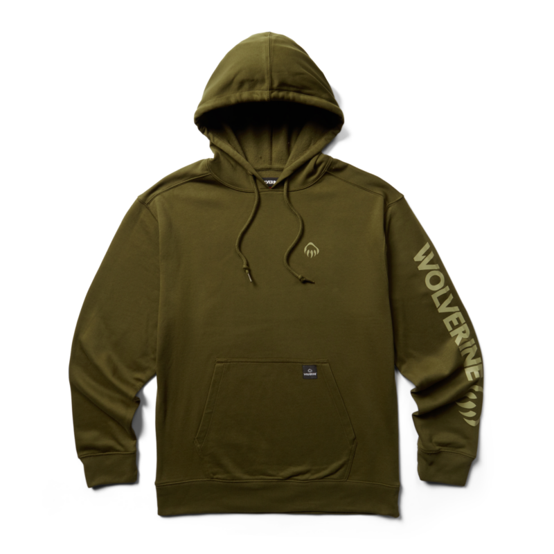 A ruggedly comfortable sweatshirt. Pullover hooded style featuring the Wolverine logo.
