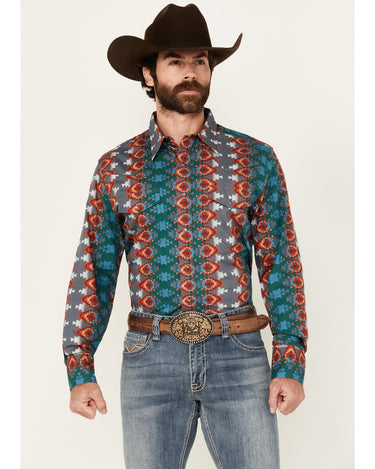 Wrangler's Checotah® has a home in the closets of cowboys around the world. This men's Checotah long-sleeve western snap Navajo-inspired printed shirt is designed to make a statement no matter the destination. It features a classic fit, a spread collar, pointed yokes, two snap flap pockets with a convenient pencil slot, adjustable cuffs, and a full-length snap closure for the finishing touch. Best of all, it's crafted from cotton for uncompromising comfort. Look sharp at a moment's notice by wearing your Checotah shirt with a Wrangler Retro® or Cowboy Cut® jean.