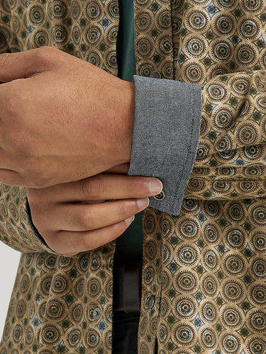 Look good while feeling good in the men's Wrangler Retro® long-sleeve western snap printed shirt. This contemporary take on the classic style you love comes packed with all the distinctive details, including pointed front and back yokes, single-needle stitching at the placket, modern fit, contrast trim, two snap cuffs, and two chest flap pockets with snaps. This long-sleeve snap shirt features a modern fit and it's crafted from cotton for comfort, minimal wrinkling, and long-lasting looks. Complete the outfit with Wrangler Retro jeans.