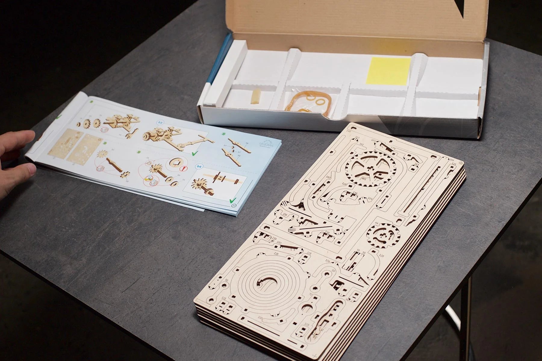 Everything you need for this fun DIY project comes right in the box, including pre-cut wooden boards, 10 marbles, plus wax and sandpaper (for optimal gear function). Each Ugears model kit, 3D puzzle, or brain teaser comes with a set of detailed, illustrated instructions in 11 languages. The Marble Run Stepped Hoist has 355 pieces, is rated "Advanced" level, and has an estimated assembly time of 8 hours. If you break a piece during construction, don't panic! Ugears models each come with a few spare parts included. If it's a unique piece that's damaged or broken, just contact our customer service and we'll gladly send you a replacement part, free of charge.