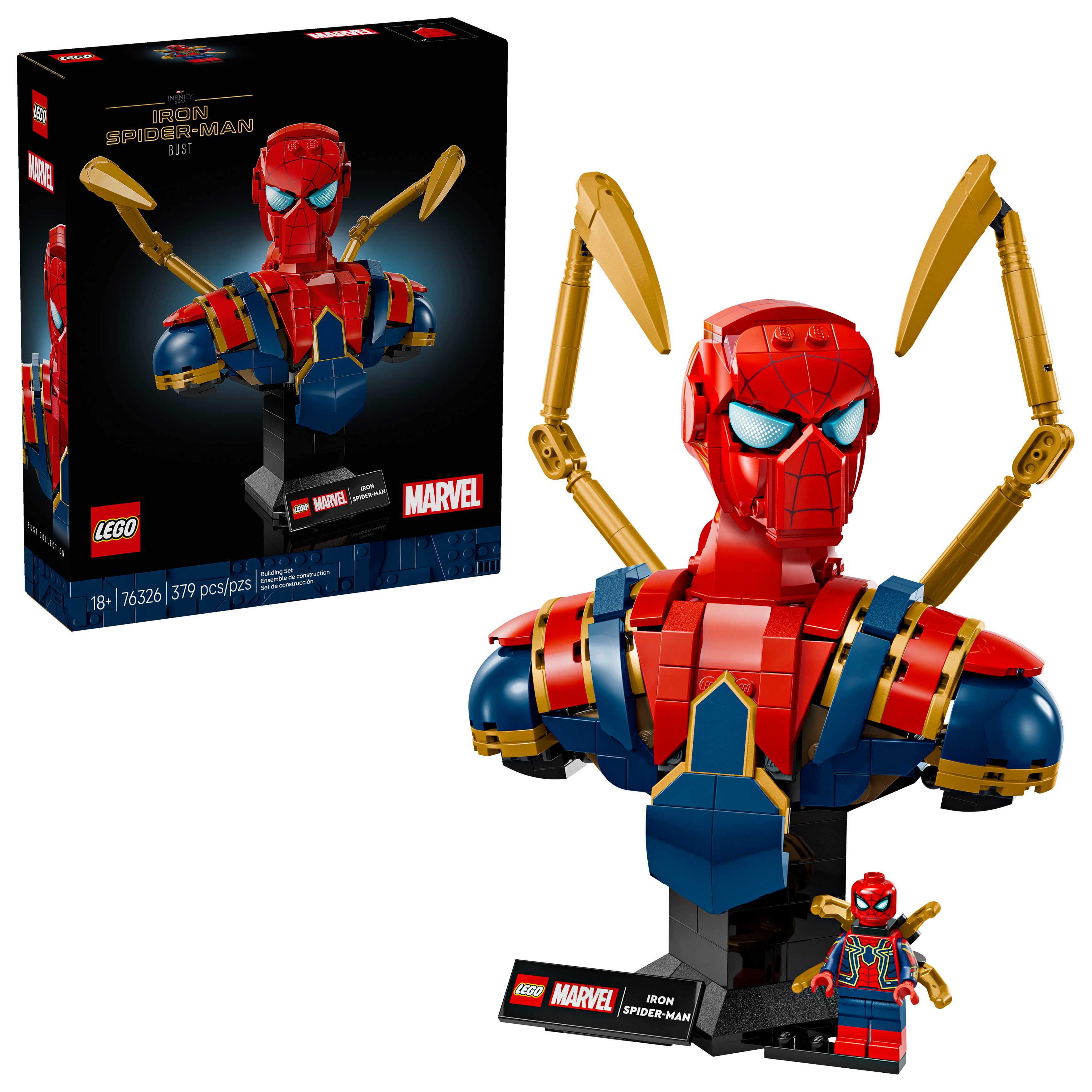 The stunning Iron Spider-Man Bust (76326) is a build-and-display LEGO® ǀ Marvel collectible set for adult enthusiasts. It makes a thoughtful gift for the Super Hero in your life, whether it’s a present for boyfriends or girlfriends, dads on Father’s Day or moms on Mother’s Day. This iconic building set features 2 movable mechanical arms and a rotatable head. It comes with 2 interchangeable bases incorporating a name plaque: one with space for a detachable Iron Spider-Man minifigure and one without. The satisfying building project is complemented by a digital version of the set’s building instructions, which can be found on the LEGO Builder app. The extensive LEGO Sets for Adults range offers model-builders a truly immersive and rewarding experience. Contains 379 pieces.