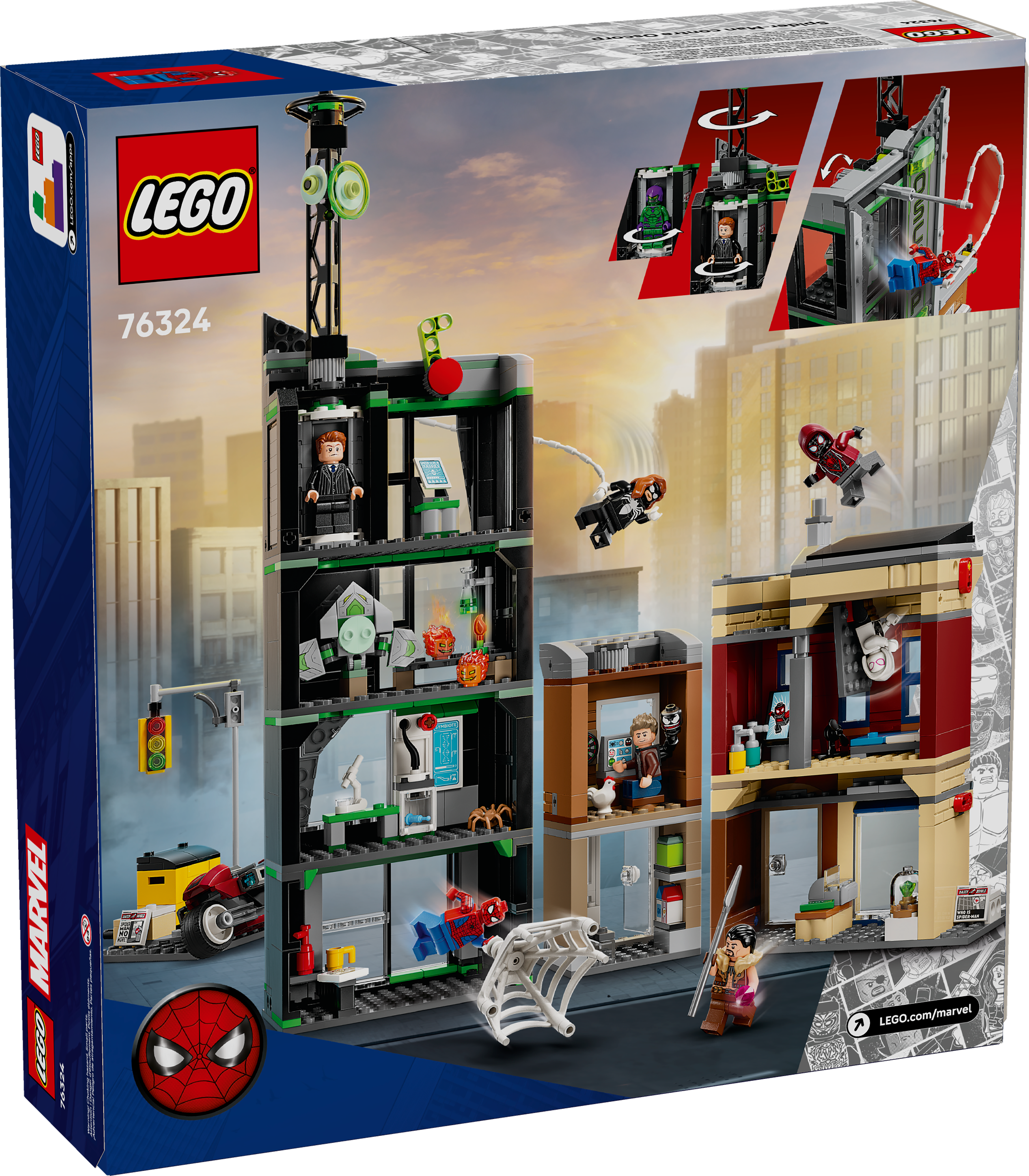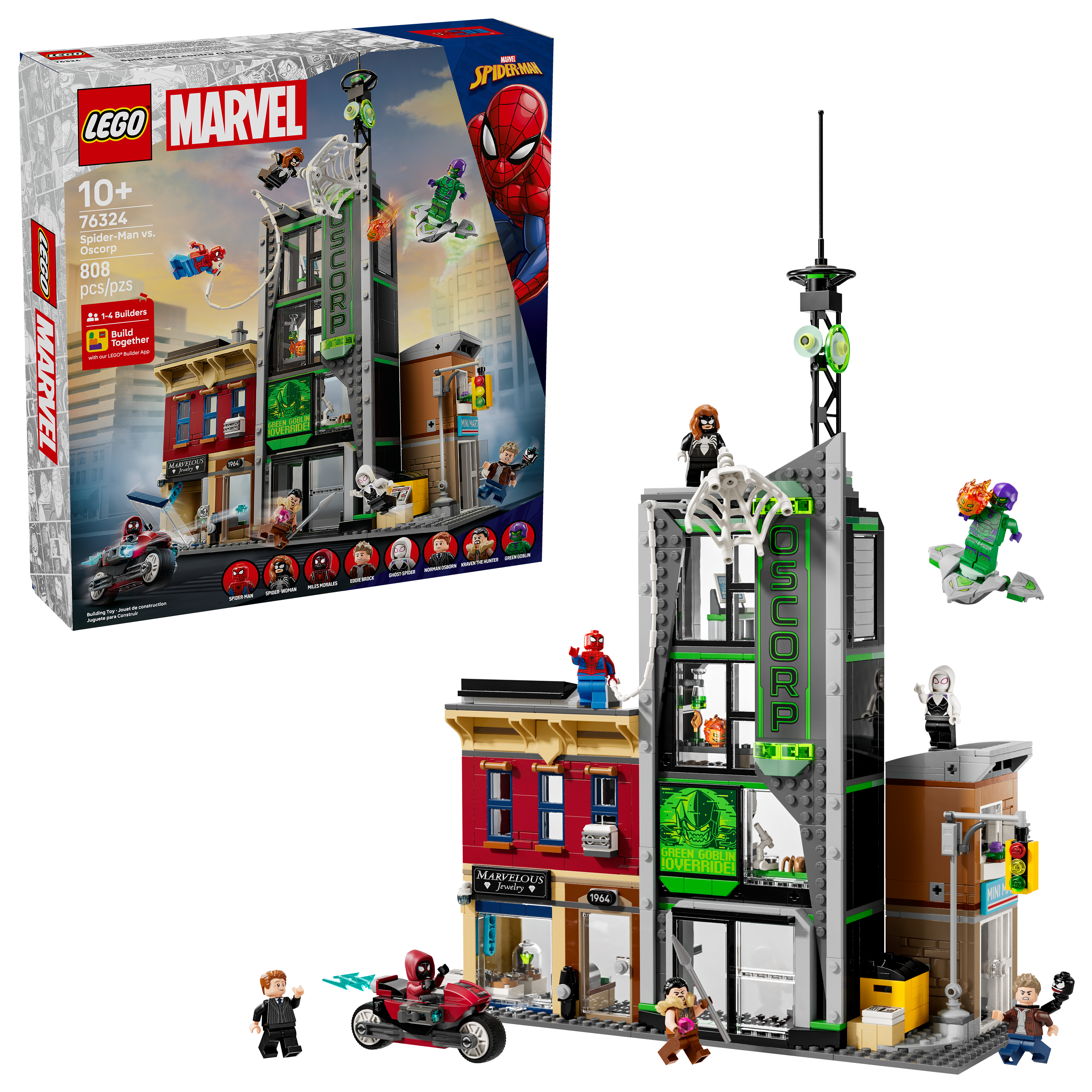 LEGO® ǀ Marvel Spider-Man vs. Oscorp (76324) is a premium build-play-and-display set that’s bursting with Super Hero action, iconic characters and famous locations. This multi-model city scene makes an impressive gift for fans of Super Heroes and Marvel collectibles aged 10 and up. The street scene comprises 3 separate buildings: Miles Morales’s apartment with a jewelry store underneath, the Oscorp building, and Venom’s apartment with a convenience store below. Each room is furnished with relevant equipment and accessories. 8 LEGO minifigures from the Marvel movies ensure endless web-slinging action: Spider-Man, Spider-Woman, Miles Morales with his motorbike, Eddie Brock, Ghost-Spider, Norman Osborn, Kraven the Hunter and Green Goblin with his glider. Transparent sticks allow kids to position and pose characters with realistic ease. Build Together on the LEGO Builder app lets friends and family share the creative fun. Contains 808 pieces.