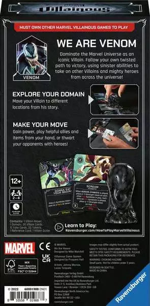 Dominate the Marvel universe as the insatiable and sinister Venom in Marvel Villainous: We Are Venom - the first single character expansion in the Marvel Villainous line. Take on the role of the symbiote and work towards a defeating Spider-Man while fighting off iconic other Marvel Heroes as they deal twists of fate to their opponents from a shared Fate deck. Manage to overwhelm Spider-Man with your Symbiote tokens before anyone else reaches their goal and you win!