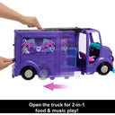 • This 2-in-1 vehicle playset features 360-degree play, rolling wheels, a kitchen with fryer, a pullout performance stage, and 13+ accessories themed to food and music storytelling!
