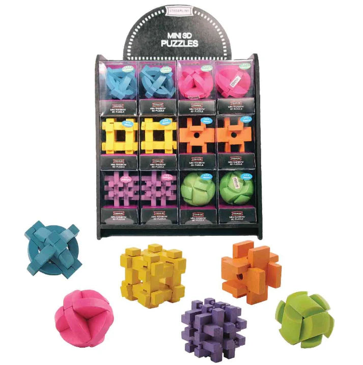 Mini 3D Brainteaser Puzzles. The Goal is to Disassemble and Reassemble the puzzle. Comes in 6 different colors. Great for parties and stocking stuffers!