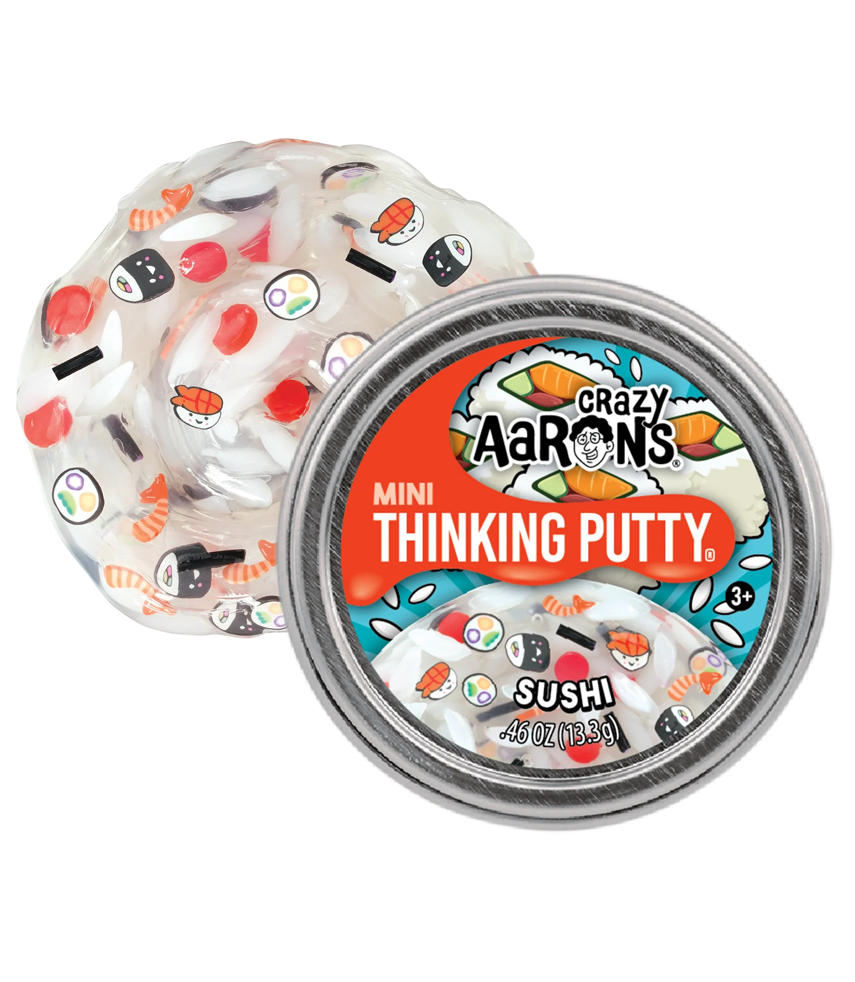 Indulge your cravings with this amazing Mini Tin of Thinking Putty™ Sushi. Includes ginger scented putty & sushi themed pieces like rice, nigiri, sushi and rolls.