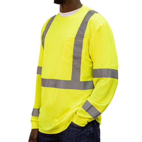 Get the job done safely with the KEY ANSI Class 3 Hi-Visibility Long Sleeve Pocket T-Shirt. The high performance fabric wicks moisture away, keeping you dry so you can stay on task. This tee is designed with a relaxed fit while providing taped neck and shoulder seams for added comfort. The reflective striping is sewn-on for durability. Also includes a left chest pocket for your convenience. Rated ANSI Class 3, ANSI/ISEA 107-2020 Compliant. Get KEY for safety and visibility.