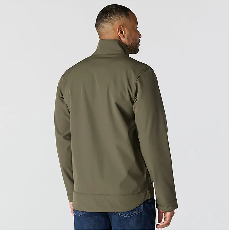 Keep working through gray, cloudy days in this men's softshell water-resistant jacket. It's made to repel light rain and fight off gusts of wind. It has built-in flex so you can move without restriction, and a mock-neck collar for a little extra coverage. A relaxed fit gives you room to move.