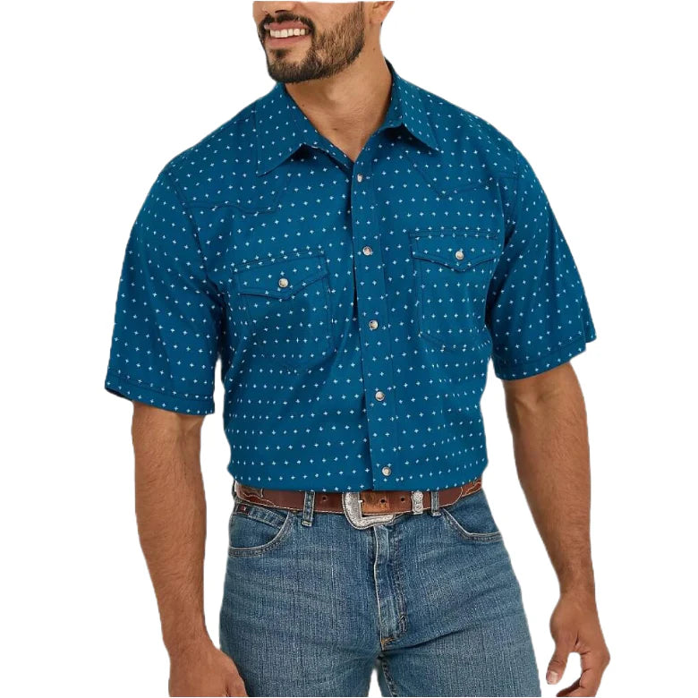 Experience unparalleled comfort and style with the Wrangler Men’s 20X® Competition Advanced Comfort Turquoise Western Snap Shirt. Crafted from a soft cotton blend with a touch of spandex, this shirt offers just the right amount of stretch for maximum mobility, whether you're in the arena or out on the town. Featuring a classic fit with authentic Western details such as one-point yokes, a spread collar, and snap flap pockets, it's perfect for both casual outings and formal gatherings.