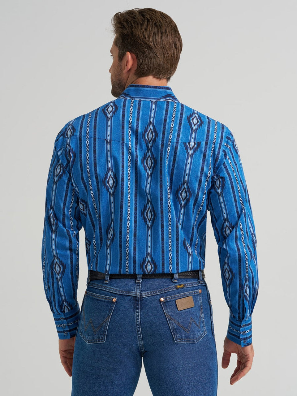 Wrangler's Checotah has a home in the closets of cowboys around the world. This men's Checotah long-sleeve western snap Navajo-inspired printed shirt is designed to make a statement no matter the destination. It features a classic fit, a spread collar, pointed yokes, two snap flap pockets with a convenient pencil slot, adjustable cuffs, and a full-length snap closure for the finishing touch. Best of all, it's crafted from cotton for uncompromising comfort. Look sharp at a moment's notice by wearing your Checotah shirt with a Wrangler Retro or Cowboy Cut jean.