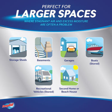 - IDEAL FOR USE IN LARGE SPACES: Hi-capacity moisture absorbers are ideal for use in large spaces like basements, garages, stored boats & RVs, crawlspaces, storage areas and anywhere excess moisture and stagnant air are a problem.