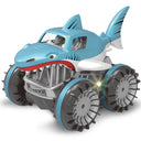 Monster Shark is a waterproof RC truck which drive freely on normal terrain or water. With a powerful engine, the Monster Shark RC can reach a maximum speed of 10mph. Its 4WD is equipped with friction-increasing crawlers on the tires, allowing it to drive on a variety of terrains, such as carpets, offroad, rocks, water, sand, grass, etc.